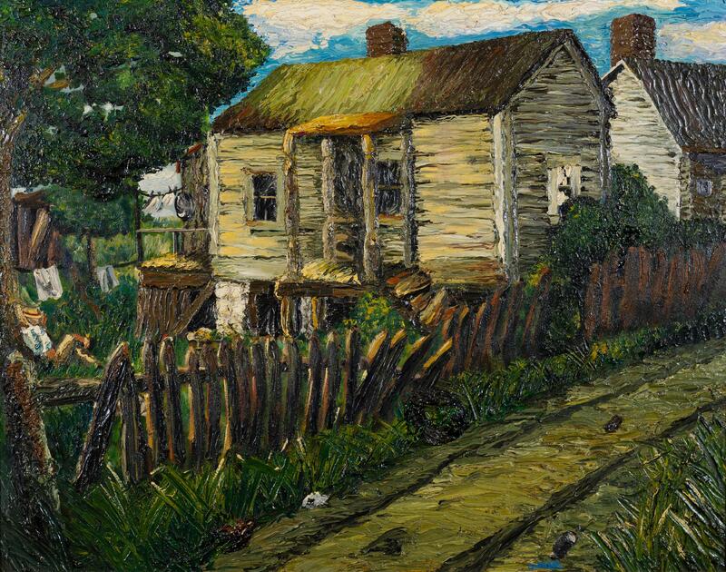Clarence Laudric Shivers was an artist and career military man who participated in the Tuskegee Program from St. Louis, MO. The House by the Side of the Road depicts a rural home behind a picket fence. This piece conveys rural life as a man lounges on a tree while clothes dry on the line.