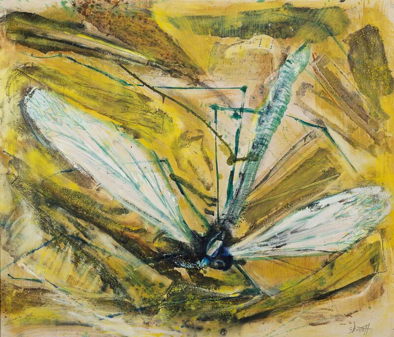 Calvin Burnett was a graphic artist, illustrator, painter, designer, and art teacher from Cambridge, MA. Insect is a painting of a dragonfly in a close-up perspective. The dragonfly is primarily bright green with long, thin legs, two white wings, and a dark blue head. A naturalistic setting of bright yellows, browns, and greens surrounds it.