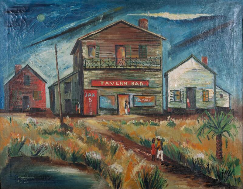 Henry Wilmer Bannarn was a Harlem Renaissance sculptor and artist who worked in pastel and free-form sketching. Louisiana Nocturne depicts the nightlife of a rural town in Louisiana. The piece shows three couples around a two-story building marked Tavern Bar. The bar is between two buildings, and a person is on both porches.