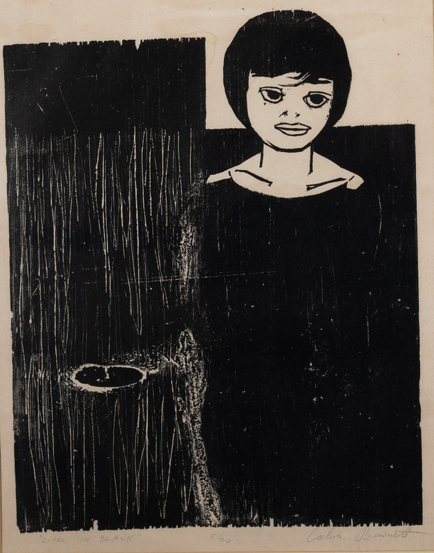 Calvin Burnett was a graphic artist, illustrator, painter, designer, and art teacher from Cambridge, MA. Girl in Black depicts a girl standing with a smug expression, wearing a Black garment. The dress blends into the dark background, while white scratches add texture to the piece.