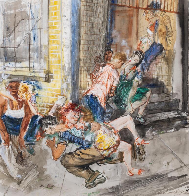 Calvin Burnett was a graphic artist, illustrator, painter, designer, and art teacher from Cambridge, MA. Horseplay is a watercolor depiction of an interracial group of young adults socializing. Two pairs are in a romantic embrace, one pair is dancing, and a trio shares a cigarette.