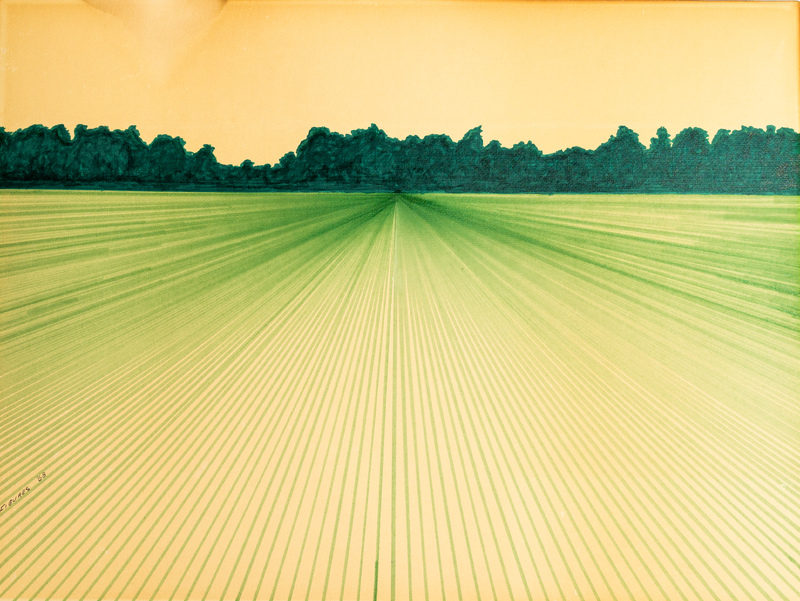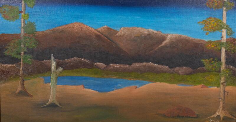Oliver Banks Jr. was an artist from Atlanta, GA. Loneliness depicts a lone valley outside of a mountain range. In the foreground is flat land with scantily leafed trees. Beyond that is a body of water that separates the valley from the foot of the mountain.
