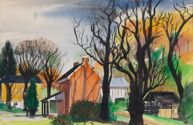 Gladys Williams Renwick was a painter from St.Louis, MO. Kirks Mill is a watercolor painting of a rural neighborhood in Autumn. The painting features four homes of various sizes and colors. There are various trees in the background: some barren and others with orange and green leaves.