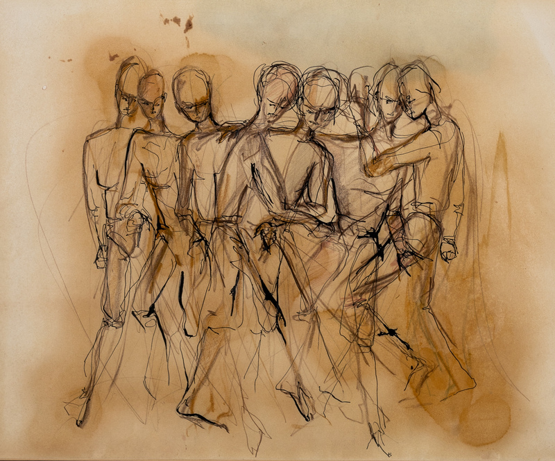 William V. Harper was an artist and art educator from Cayuga, Ontario, Canada. Group Study #1 is a gestural drawing focusing on several human figures' physical composition. Lines of body parts overlap, and each figure moves in different positions and directions.