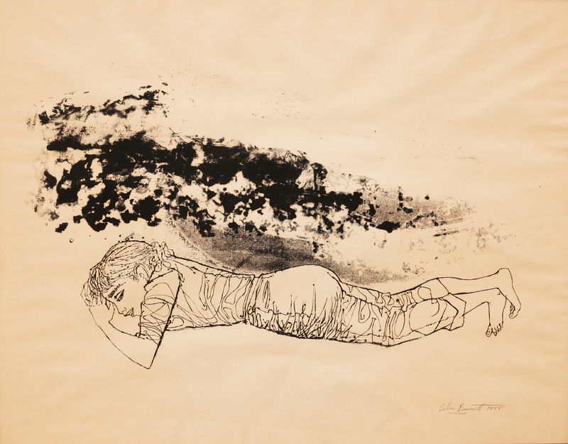 Calvin Burnett was a graphic artist, illustrator, painter, designer, and art teacher from Cambridge, MA. Girl Waiting depicts a young girl lying asleep with dark shadows above her.