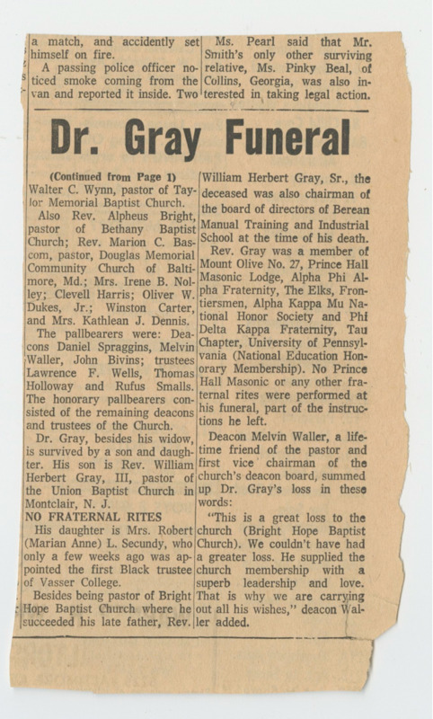 These newspaper clippings discuss the unfortunate passing of former Florida A&M President Dr. William H. Gray, Jr. Gray allegedly had a premonition of his death before it occurred, giving his wife instructions on what to do.