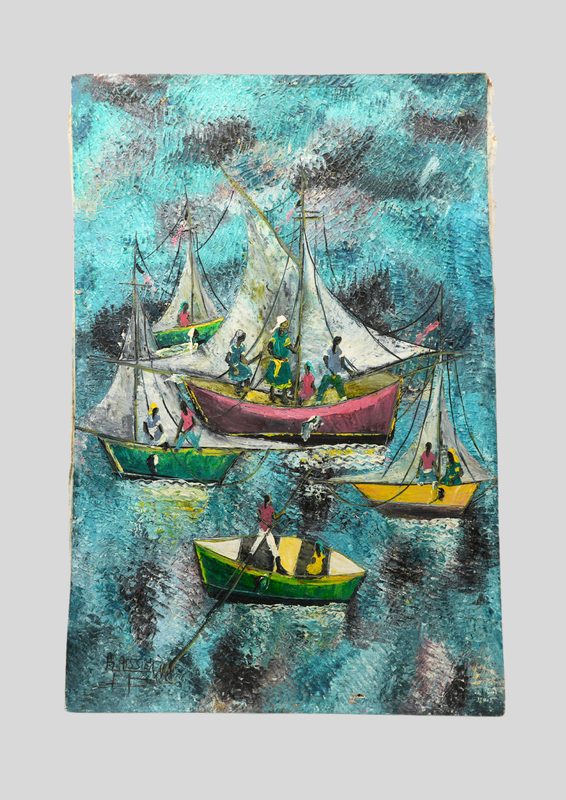 This untitled painting from the FAMU Black Archives/Caribbean Art Collection has limited identifiers for proper attribution but is associated with Dr. James Eaton and Frank Pinder Collections. The piece is of a boating community sailing in the ocean and features an illegible inscription on the lower left corner that could be the artist’s signature.