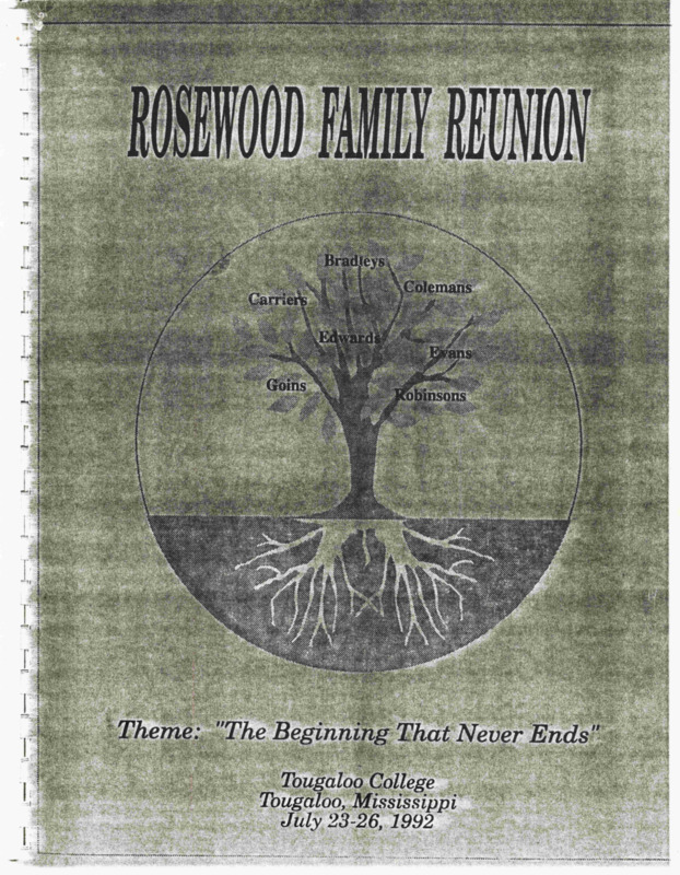 This program booklet is from an event that Tougaloo College, in Tougaloo, Mississippi, set up from July 23 to July 26, 1992. With the theme, “The Beginning That Never Ends,” Tougaloo College president Adib A. Shakir honors Rosewood victims by putting on a family reunion complete with a Sunday school and banquet.