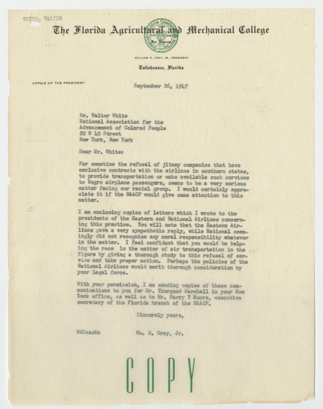 This letter between former Florida A&M president William H. Gray, Jr. and Walter White of the National Association for the Advancement of Colored People (NAACP) discusses discrimination of jitney companies that have exclusive airline contracts in the South. These companies refuse to provide transportation to Negro airplane passengers.