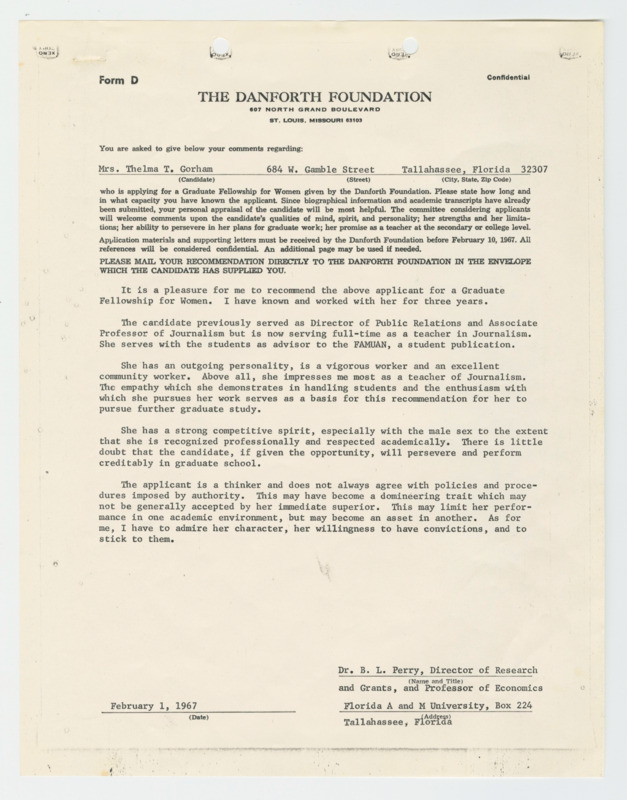In this form, Dr. B. L. Perry, then serving as the Director of Research and Grants, pens a fervent letter of recommendation for a young Thelma T. Gorham, applying for a Graduate Fellowship for Women by the Danforth Foundation. Gorham would go on to become the founder and Dean of Florida A&M University’s distinguished Journalism school (SJGC).