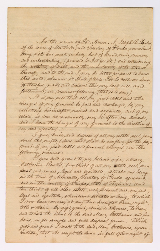 Joseph B. Rowles himself wrote this document when he felt his illness was worsening and death was imminent. Within this will and testament, Rowles divided his estate, which included slaves, between his wife and brother. Descriptions of the enslaved were included, ranging from “good” to “doubtful” and “bad,” along with other numerical information.