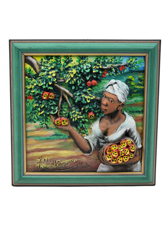 This unique 3D painting by Richard Atkinson, a Jamaican-born artist, could only be achieved through paper mâché. Belonging to the Leo P. Sam collection, the piece features a woman in white picking what appears to be fruit but could be flowers, from a tree.