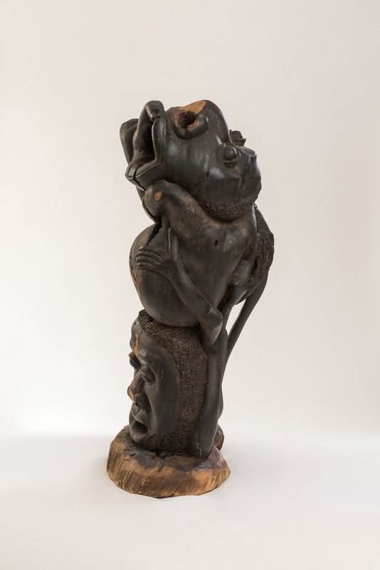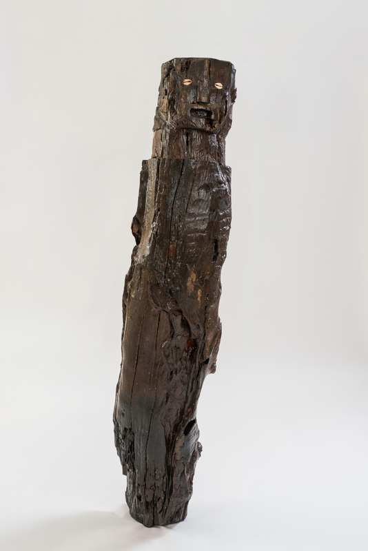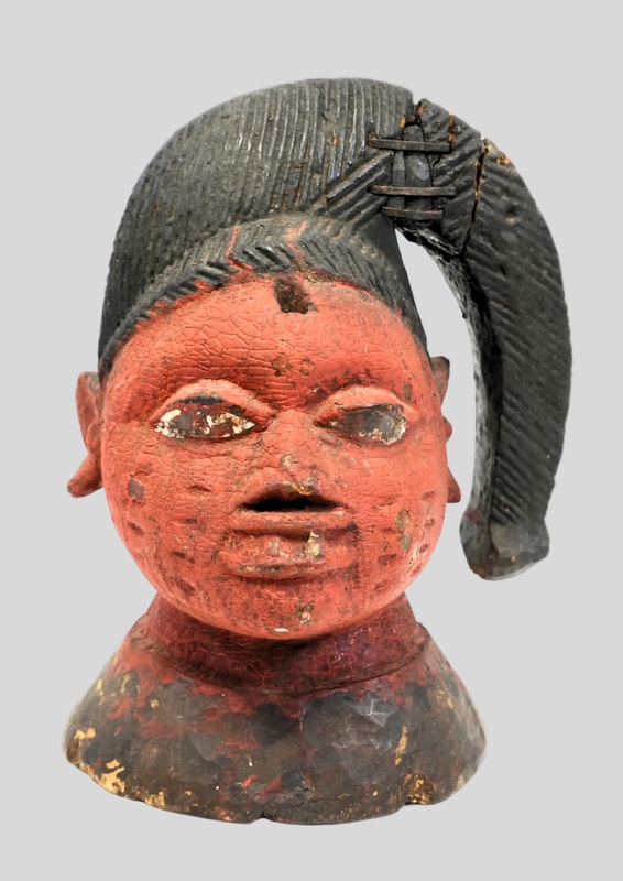 This sculpture is reminiscent of the twin commemorative figure, but its facial features have faded. This figure is cared for as if it were a child; in Yoruba culture, twins are considered powerful spirits who bring riches to the family. The cowrie shell top it wears serves as an offering to Sango, the deity who rules over the twins’ health.