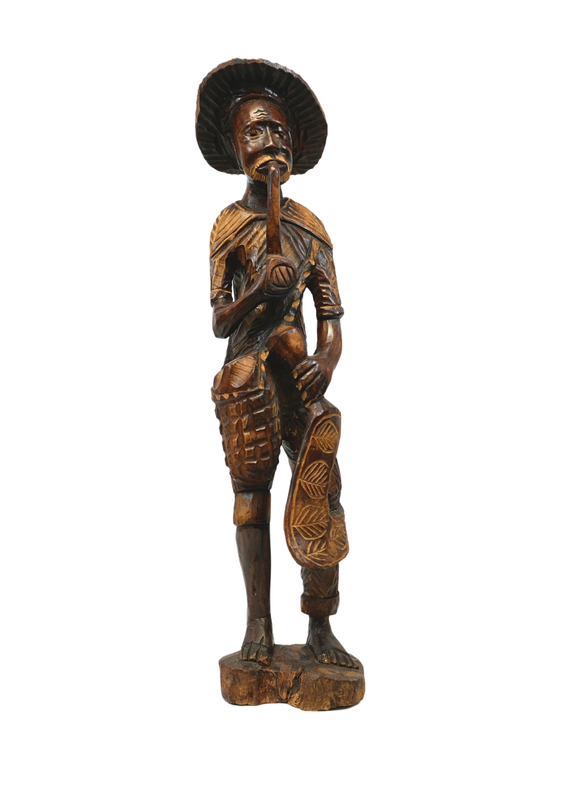 This hand-carved, wooden sculpture depicts a Caribbean or African man holding what appears to be a pipe and sheathed weapon, possibly a machete, ax, or knife. The object he is holding could also be a musical instrument, but similar statues can attribute him to a farmer or worker.