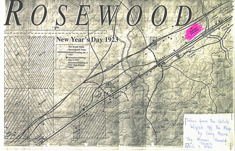This document is a map of Rosewood on New Year’s Day 1923, taken from the article, “Wiped Off the Map” by Gary Moore for the Miami Herald Tropic’s March 1993 issue. The points on the map detail the homes of every name involved in the story to show the proximity of the witnesses and the paths the mob traveled when destroying the town.