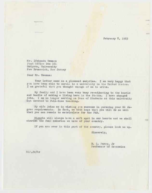 In this letter between Dr. B. L. Perry, Jr. and Ifekandu Umunna, Perry updates Umunna, a Nigerian master’s student, on his and his family’s personal lives. This was an example of the long-lasting, sentimental bonds Perry created during his visit to Nigeria.