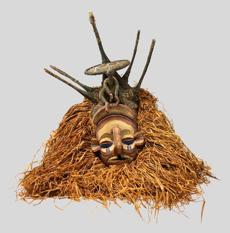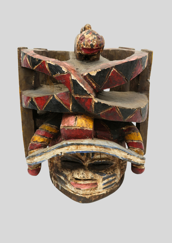 In Nigeria, the Yoruba Gelede performance celebrates women (awon iya wa; “our mothers”), including mothers, grandmothers, living and dead female ancestors, and elderly women. Performers wear the headdress like the one here and have their faces covered by a cloth veil. Each wooden mask is repainted in vibrant colors for each performance.