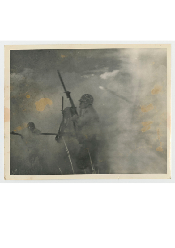 This riveting black-and-white photograph is an action shot of three running soldiers seemingly engaged in battle, holding weapons and engulfed in smoke. It is unclear who took this picture or when, but it was found in the Thelma Gorham collection, the former Florida A&M Dean of Journalism and Graphic Communication and wife of a Black soldier.