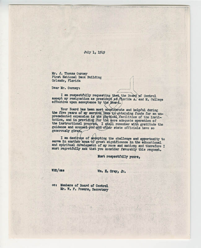 After five years as FAMC president, W. H. Gray tendered his resignation to the Board of Control, effective July 7, 1949. He expressed gratitude for his tenure and interest in pursuing new opportunities. In a separate note, he cited developments prompting his decision and plans to discuss further with Dr. C. C. McCracken.