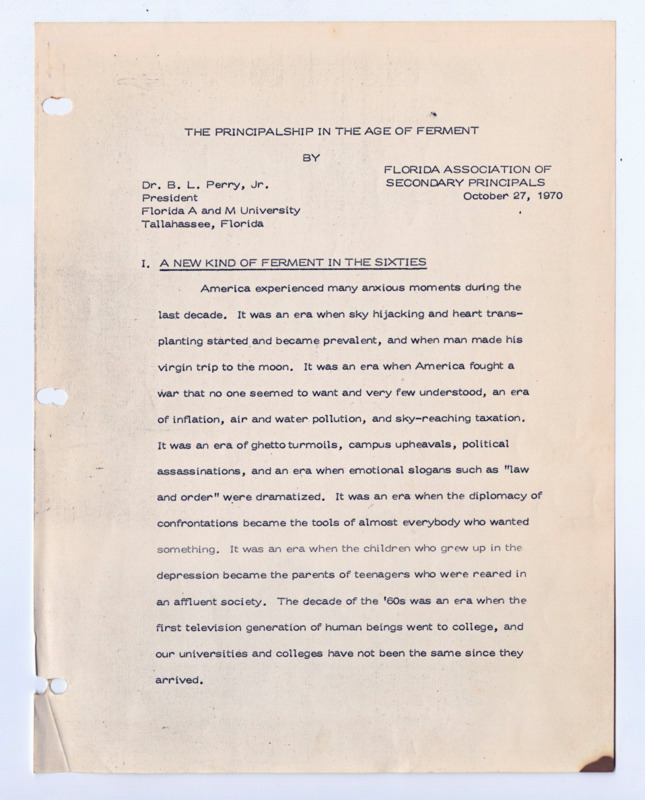 Dr. Benjamin L. Perry, Jr delivered this speech to the Florida Association of Secondary Principals in 1970. In it, Perry offers a historical snapshot of the current events of the time, i.e., the moon landing, civil unrest, and political assassinations, to discuss the future of education amongst its leaders.
