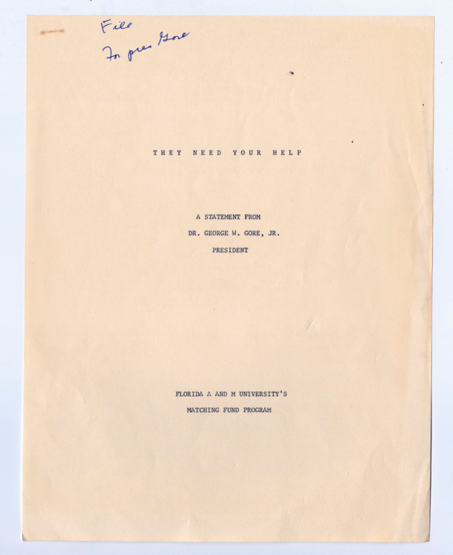 As President of Florida A&M University, Dr. George Gore made a plea to supporters on this mailing list asking for volunteer donations. For every dollar raised in the NDEA and Federal Work-Study programs, nine dollars were to be matched in grants, but because FAMU didn’t raise enough money, it lost out on funds at a detriment to its students.