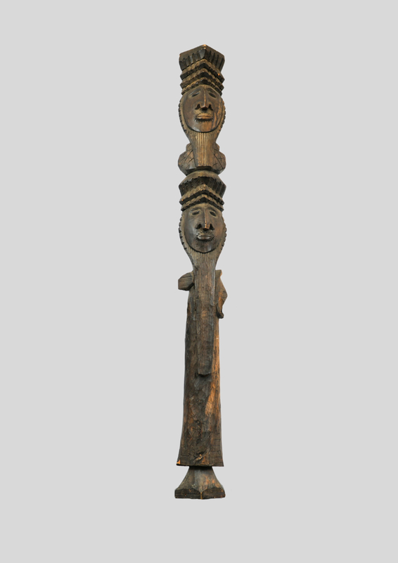 There is limited information on this African artifact. Still, it is confirmed to be a hand-carved wooden replica of a Tiki or totem pole in fair condition due to visible scratches and patina. It features two long-bearded men sitting on top of each other. They could be ancestors, spirits, or essential pillars in the community.