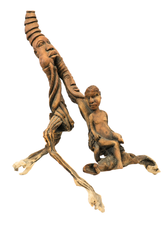 There is limited information on this vintage African artifact, but it is confirmed to be a hand-carved wooden sculpture in fair condition due to a crack on the back leg of the piece. The piece features a small boy sitting on what appears to be a tree branch (or bone marrow) with two human faces on it while a snake wraps around the tree.