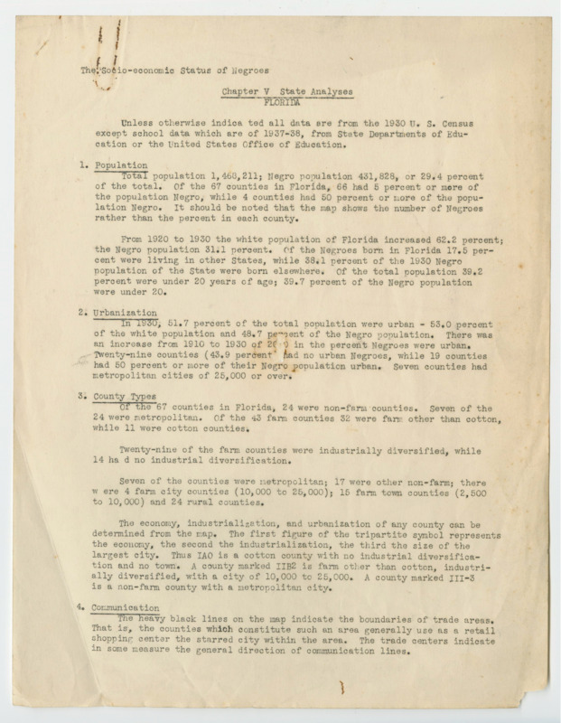 Utilizing data from the 1930 U.S. Census and 1937-1938 school data from the State Departments of Education and the United States Office of Education, this study is an analysis of Florida’s Negro population. It holds statistics on the Negro population, economic status, higher education opportunities, occupations, and more.