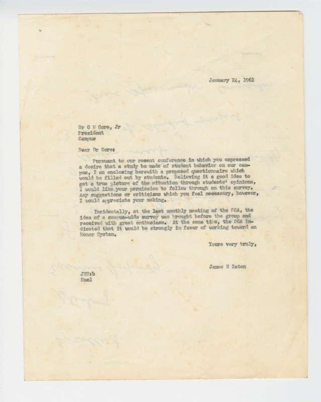 A letter from James Eaton to President George W. Gore discusses plans for conducting a schoolwide student survey, with input from the Student Government Association (SGA) during their monthly meeting. The survey aims to gather student feedback on campus life and emphasizes the importance of student involvement in shaping the school's future.