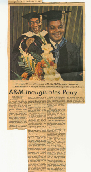 This news article features a rare photograph of the peaceful presidential transition of power at the formal inauguration of Florida A&M President Benjamin L. Perry. In the picture, a smiling B. L. Perry gets assistance with his hood from a beaming former president, George W. Gore.