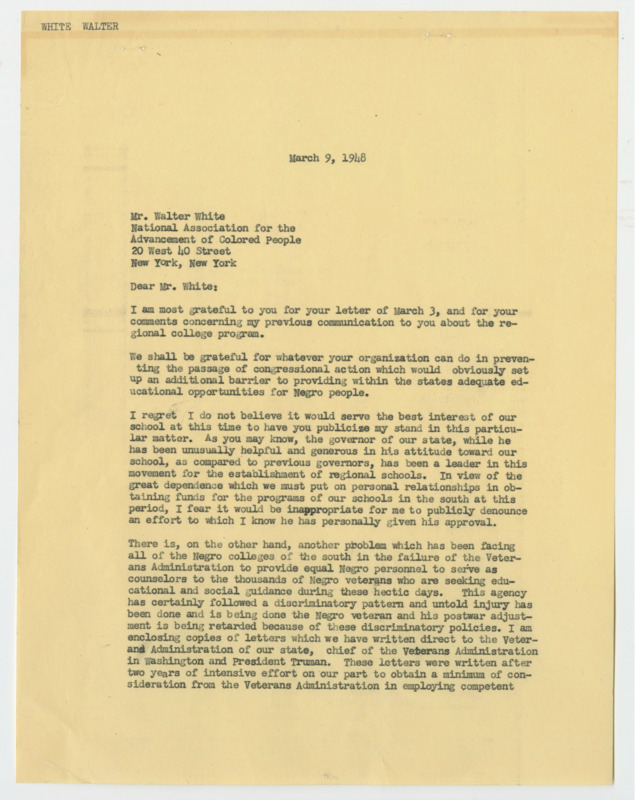 This letter between former Florida A&M president William H. Gray, Jr. and Walter White of the National Association for the Advancement of Colored People (NAACP) discusses the Southern Regional College Plan. Gray wished to stray from the publicity of the controversy; thus, he addressed issues of the Veterans Administration.