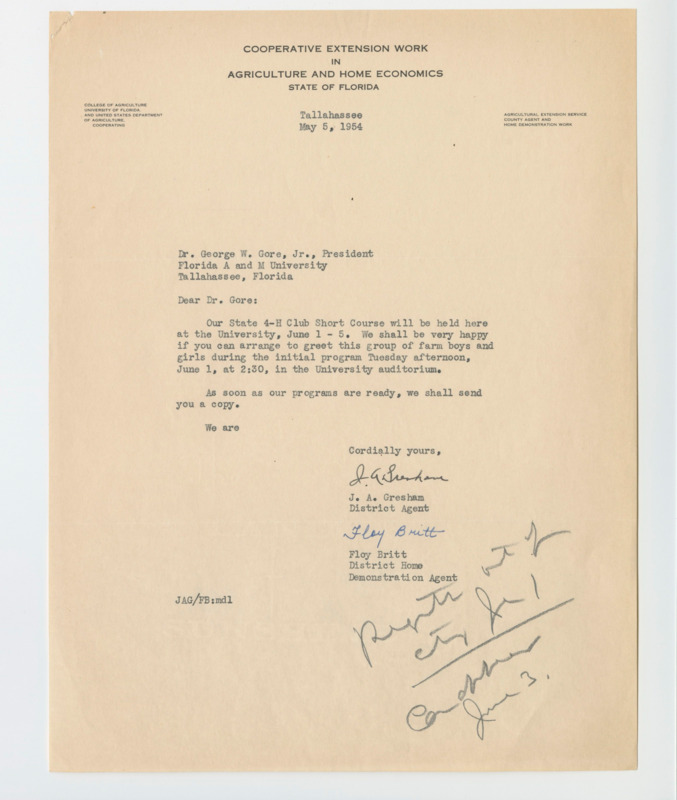 Recurring letters sent between President Gore and Negro District Agents have consistently featured invitations to the 4-H Annual Short Cours and program statistics. This highlights the ongoing efforts to elevate educational standards in Florida's agricultural and home demonstration programs.