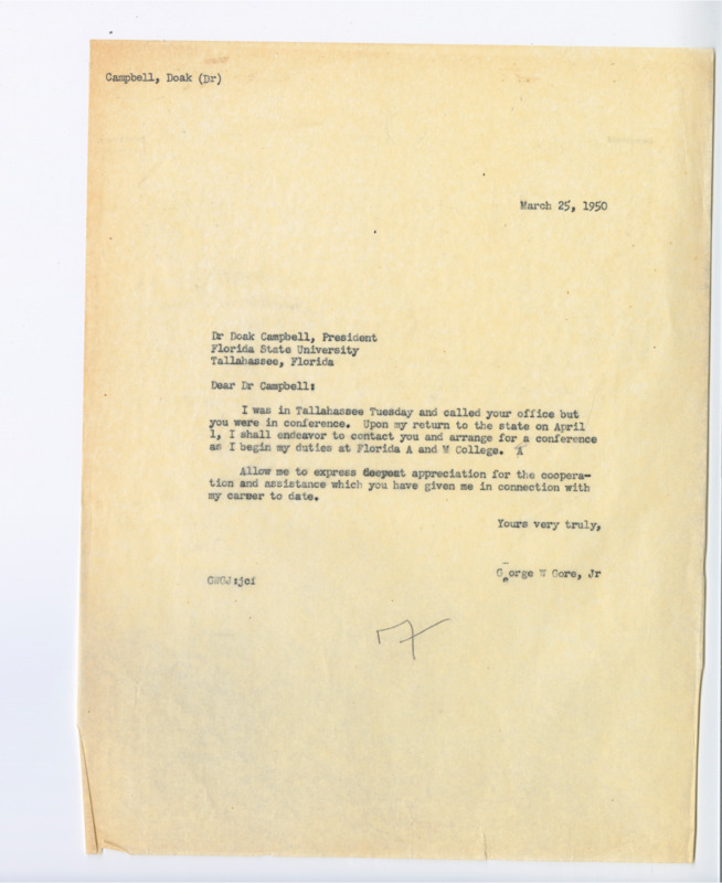 In this letter, President Gore of Florida A&M College wrote a meeting invitation to President Doak Campbell of Florida State University to discuss initiatives that would benefit both institutions and strengthen desegregation efforts. Gore emphasized a need for educational resources and support for diverse student bodies.