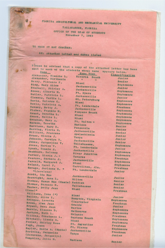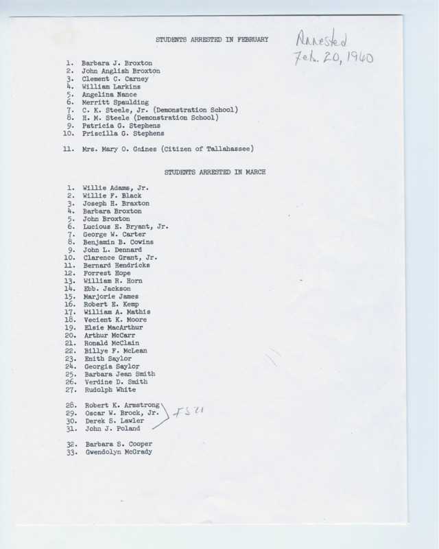 A list from February 1960 records the arrest of 32 individuals, including 30 FAMU students and civil rights leader C. K. Steele. The arrests followed student-led protests advocating for desegregation and civil rights, marking a pivotal moment in the university’s involvement in the broader movement for social justice.