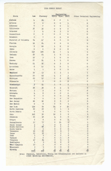 The 1940 Census Report included data on student enrollment in majors like engineering, law, and pharmacy across all 50 states. It also featured financial details of Baker House dining services, including expenses and net profit, along with grants for Negro land-grant colleges, denoting funding support for these institutions.
