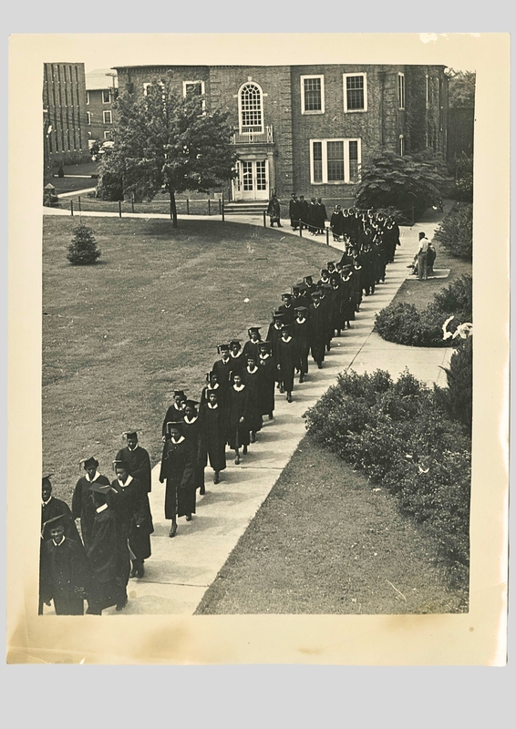 This photograph shows a glimpse into Florida A&M campus life in its early days. Graduating students in a double file line march through campus in graduation memorabilia while others look on. It is unclear when this photograph was taken as no significant identifying information exists.