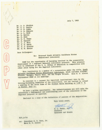 A series of letters between then Director of Research and Grants, B. L. Perry, Jr., and several colleagues, including President Gore, and proposal materials. FAMU collaborated with deans of universities based in Puerto Rico, the Virgin Islands, and the Southeastern region to create a research laboratory funded by the U.S. Office of Education.