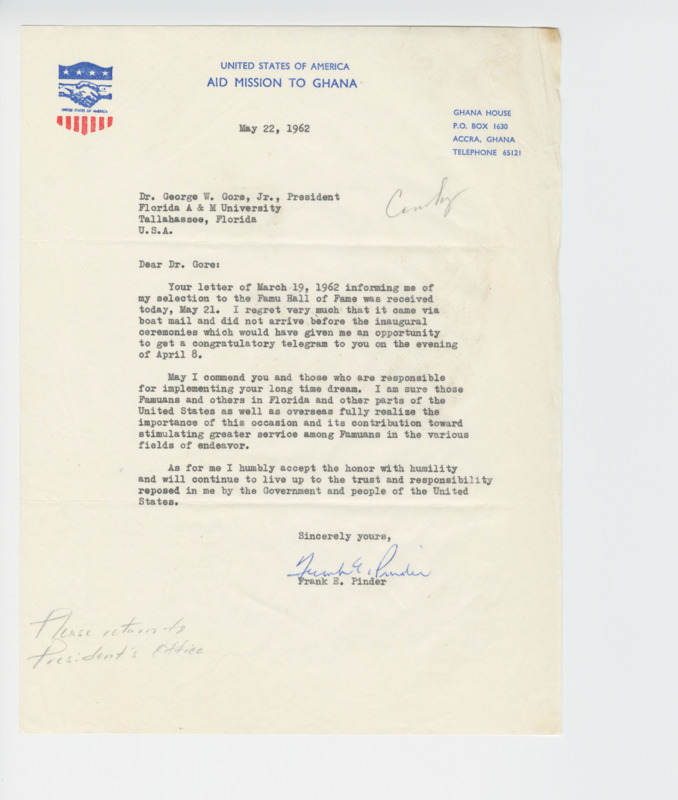 A letter from alumni Frank E. Pinder, based in Accra, Ghana, to President George W. Gore, expressing his gratitude with humility for his selection to the FAMU Hall of Fame. Pinder conveys his deep appreciation for the recognition and acknowledges the university’s impact on his life and career.