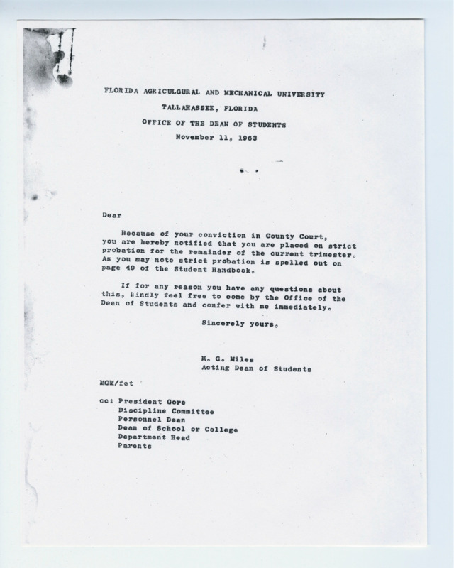 A letter sent to all students on November 11, 1963, detailed disciplinary actions under President Gore’s administration. Records showed 108 students faced academic probation, fines owed to the university, or indefinite suspension, reflecting strict enforcement of university policies during a period of heightened campus unrest.