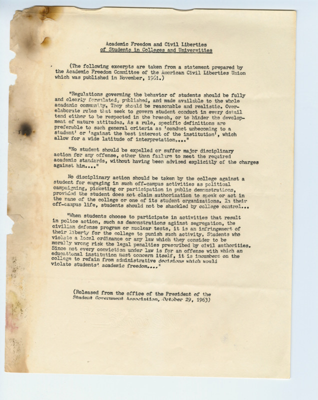 A letter released in 1961 affirms the academic freedom and civil liberties of students at colleges and universities. It states that students will not face academic punishment for breaking the law under circumstances but may face civil charges or significant disciplinary actions, ensuring a balance between personal rights and institutional policies.