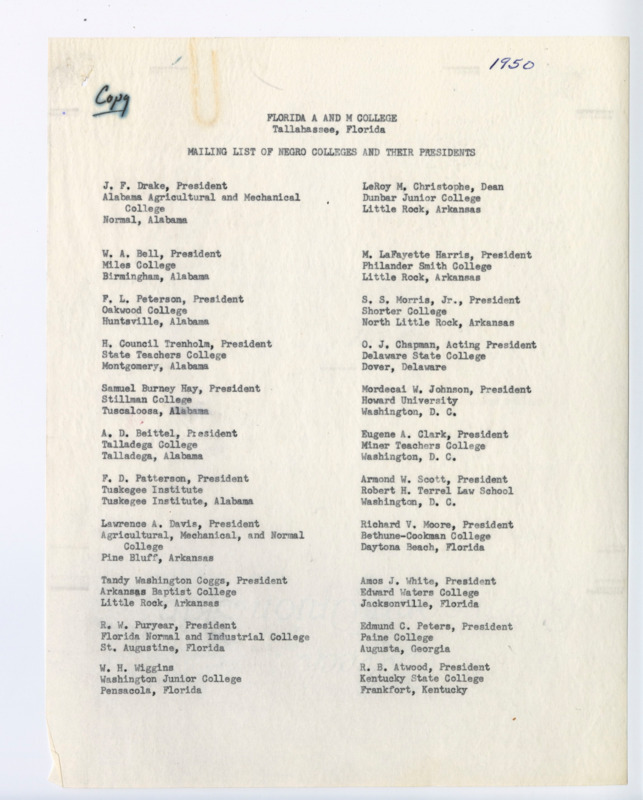 During President George W. Gore's tenure, Florida A&M College compiled a list of the 101 negro colleges and universities with each of their prospective presidents above them. This list also included the locations of each institution.