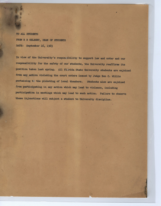 A letter sent on September 16, 1963, from the Dean of Students emphasized the university's responsibility to uphold law and order, as well as its duty to ensure student safety. It warned students to avoid unnecessary actions that could lead to injunctions, reminding them that such behavior would result in disciplinary measures.
