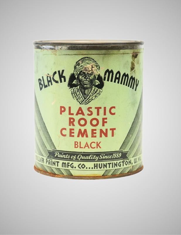 The vintage can of Black Mammy Plastic Roof Cement features a depiction of a Black female figure, reflecting the problematic stereotypes prevalent in mid-20th-century advertising. Often portrayed as a caretaker or domestic figure, this imagery reveals the complexities of racial representation and the commodification of Black identity.