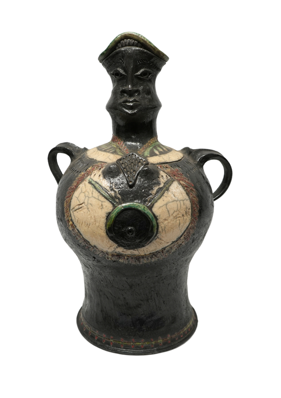 This rare pot is an original work of Yvonne and Curtis Tucker, a ceramic artist duo who developed a new art form, Afro-Raku. Their collaboration spanned 26 years and focused on honoring the past and the Black diaspora through West African spirituality. This pot, “Sunday Sister,” was meant to identify women as a classical, beautiful vessel.
