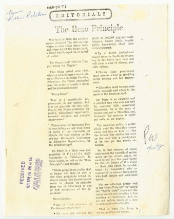 An editorial release from Florida A&M University’s Public Relations Office that discusses a recent speech made by Dr. Benjamin L. Perry, Jr. at the University of Florida, “The Bozo Principle.” Perry essentially uses a metaphor of the origins of a racist carnival game to discuss his vision for the future of marginalized communities.