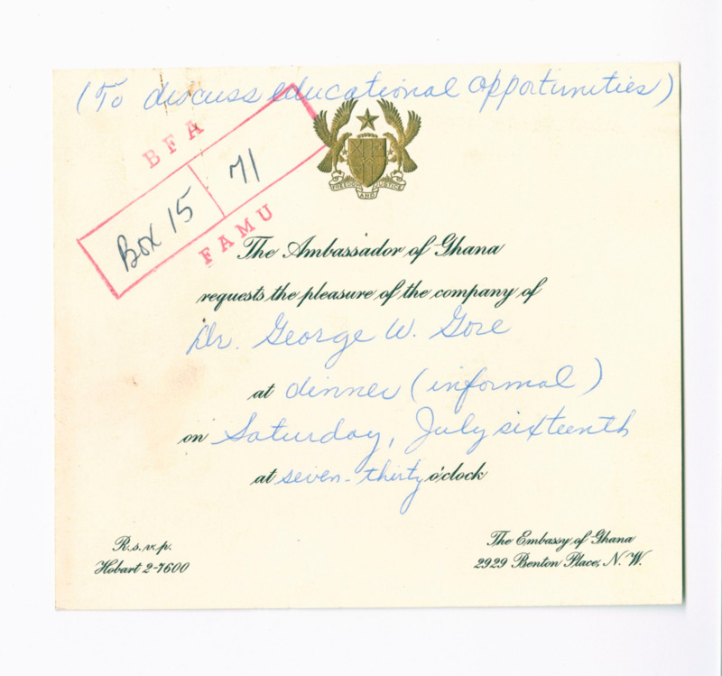 Letters between President Gore and the Embassy of Ghana outline plans to expand Ghanaian student opportunities at FAMU. A follow-up letter details meeting times and locations, and a message of delivery with photos to the Ambassador, showcasing the collaborative efforts to enhance access to higher education.