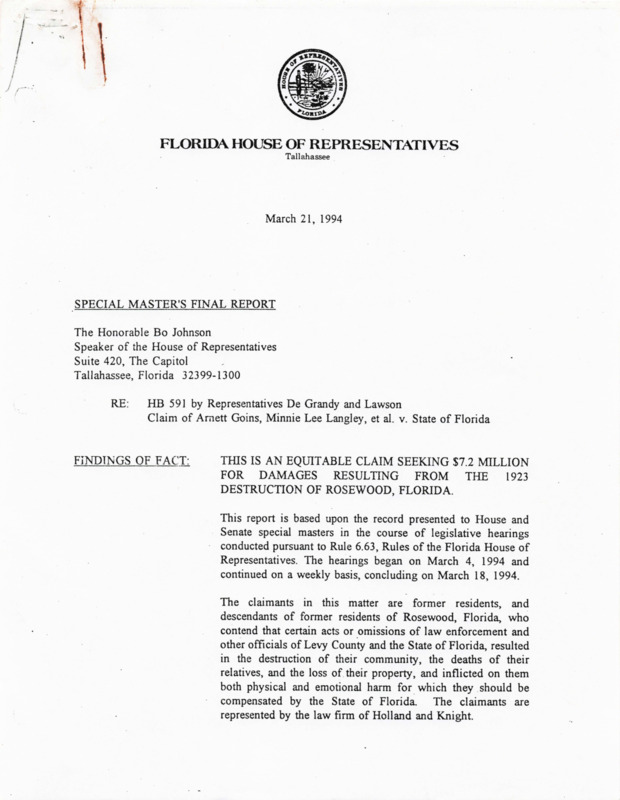 A final report from the Special Master Hearing on Rosewood, outlining the Civil Rights Office's pursuit of $7.2 million in compensation. The report addresses claims of loss of enjoyment of life, references past Congressional cases, and argues the incalculable value owed to descendants after the devastating events.