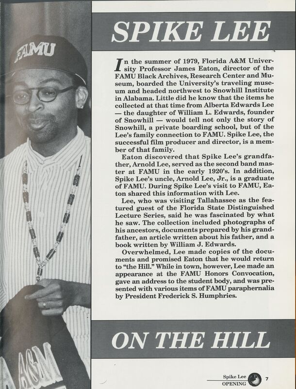In the summer of 1979, Director of the Meek-Eaton Black Archives Research Center and Museum, James Eaton, discovered Spike Lee’s grandfather was a graduate of Florida A&M and served as the second bandmaster in the early 1920s. After Eaton shared this with him, Lee returned to FAMU to give an address to students.