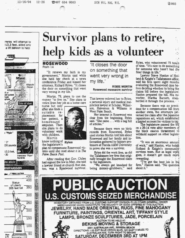 This 1994 newspaper article features a survivor of the Rosewood Massacre who received restitution from the government. Previously knowing nothing about the plan to compensate victims until reading about it in the Palm Beach Post, Robie Mortin, 79, plans to retire from her job as a home-care nurse and go into volunteer work with children.