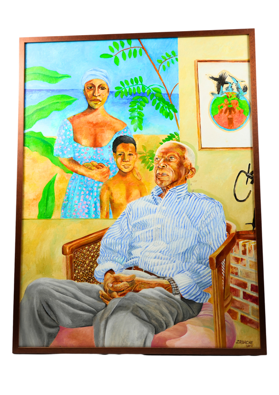 This 2014 painting is of an older man sitting in front of a painting of a woman and a little boy (probably his mother). The portrait was created by Joseph “Joe” Roache, a Florida A&M alum and former professor who has exhibited his oil, acrylic, pencil, and computer artworks in LeMonye Arts, the Mississippi Museum of Art, and more.